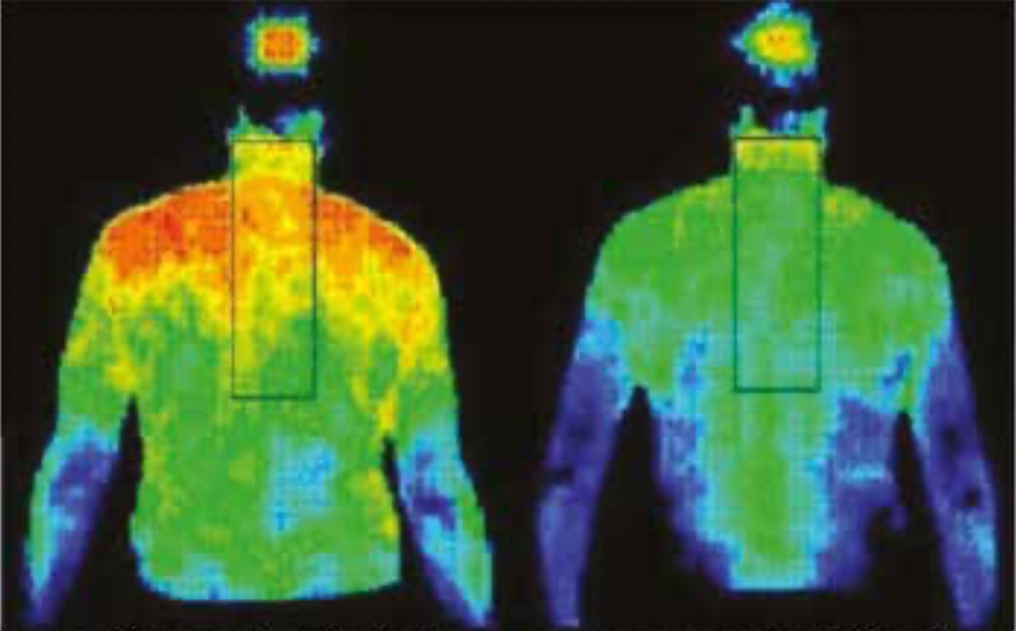 A sinistra una termografia di un paziente che dorme su una geopatia. Soffre di dolore alle spalle. A destra termografia dello stesso paziente dopo che la geopatia è stata tolta.